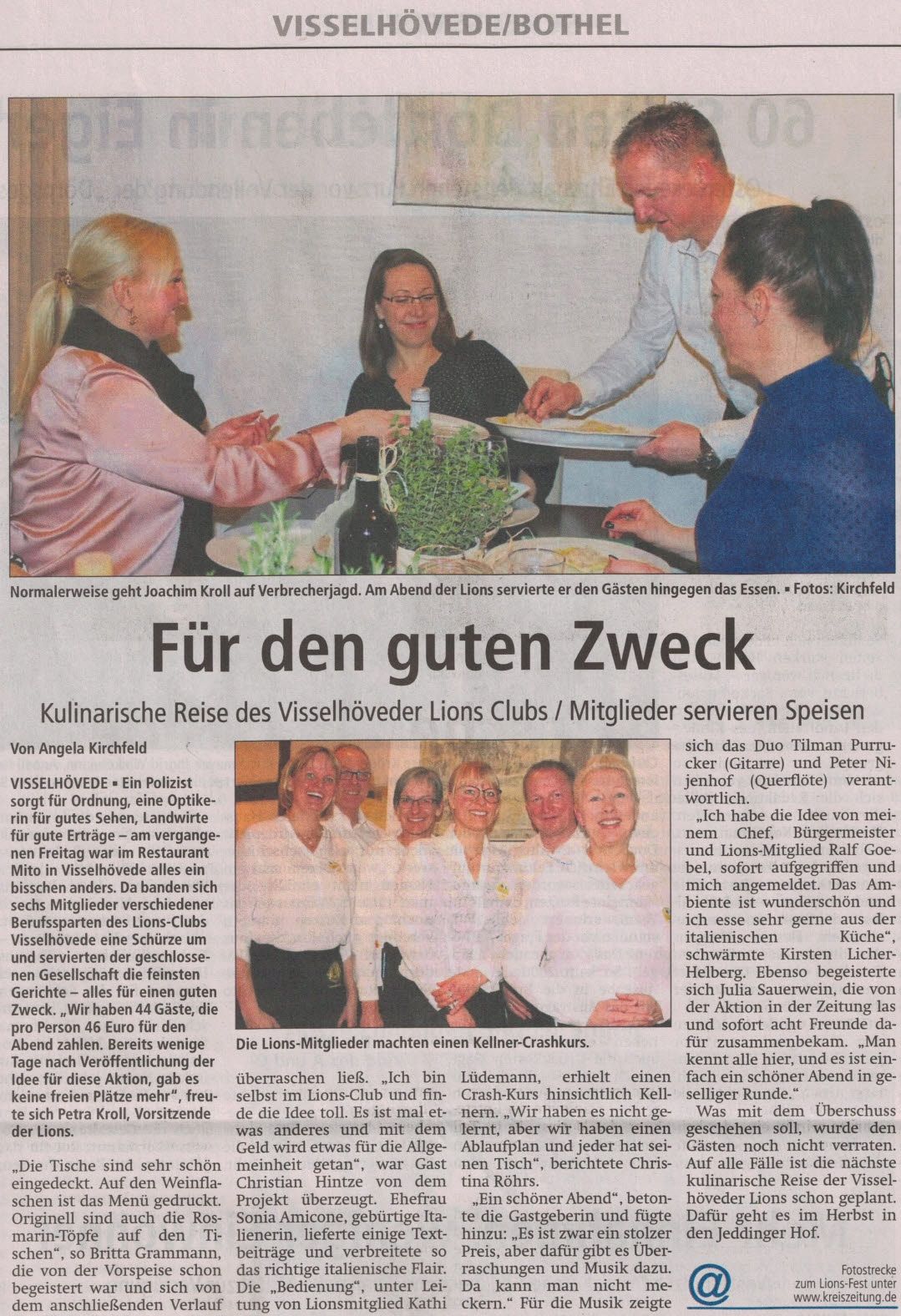 Konkret bedeutet das: Zweimal jährlich soll in jeweils einem anderen Restaurant ein kulinarisches Verwöhnprogramm angeboten werden. Zunächst startete der Club eine Abfrage bei allen Gastronomen in Visselhövede und in den Ortschaften. „Alle Wirte sind angetan von der Aktion und wollen mitmachen“, so Kroll in einer Pressemitteilung des Clubs. Nun losten die Lions aus, mit welchen Restaurants die kulinarische Rundreise in diesem Jahr beginnen soll. Das Los für die Auftaktveranstaltung am Freitag, 16. März, fiel auf das Mito in Visselhövede, im Herbst führt die Rundreise weiter zum Jeddinger Hof.