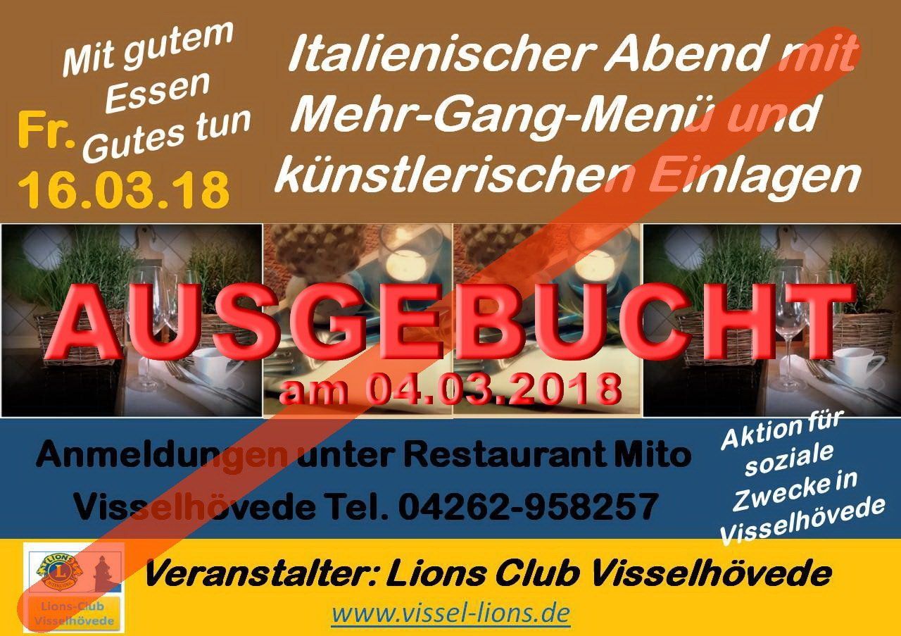 „Die Idee ist ganz einfach und vielleicht gerade deshalb eine spannende Sache: Das gastgebende Restaurant stellt für den Abend ein Vier- bis Fünf-Gänge-Menü zusammen und liefert damit einen besonderen Einblick in seine kulinarischen Besonderheiten“, so Kroll. Die Lionsmitglieder des Clubs übernehmen die Dekoration, den Service und sorgen für die musikalische oder literarische Untermalung. „Auf die Teilnehmer wartet somit ein spannender Abend mit sicher ungewohntem Service und der einen oder anderen Überraschung.“ Timo Tespe, Inhaber des Restaurants Mito, habe bereits ein interessantes Menü zusammengestellt. Für 46 Euro bekommen die Teilnehmer einen besonderen Begrüßungsdrink, es erwarten sie dann italienische Leckerein, die nicht immer auf der Karte zu finden sind. Die Mitglieder des Lions Clubs schlüpfen in eine ungewohnte Rolle und werden den Service übernehmen. Das spart auf der einen Seite Personalkosten und erhöht auf der anderen Seite den Anteil, der an einen guten Zweck gehen soll.