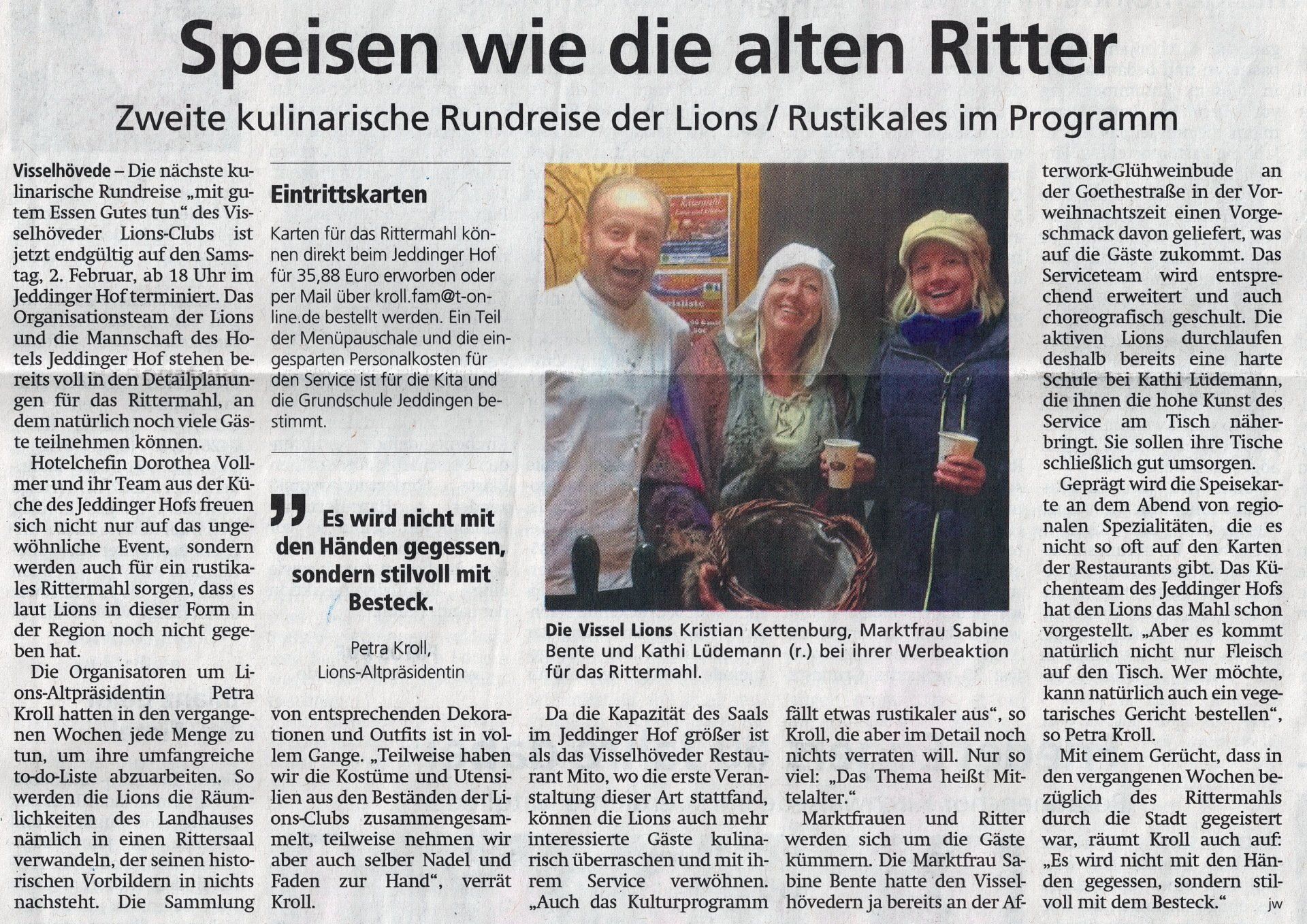 Konkret bedeutet das: Zweimal jährlich soll in jeweils einem anderen Restaurant ein kulinarisches Verwöhnprogramm angeboten werden. Zunächst startete der Club eine Abfrage bei allen Gastronomen in Visselhövede und in den Ortschaften. „Alle Wirte sind angetan von der Aktion und wollen mitmachen“, so Kroll in einer Pressemitteilung des Clubs. Nun losten die Lions aus, mit welchen Restaurants die kulinarische Rundreise in diesem Jahr beginnen soll. Das Los für die Auftaktveranstaltung am Freitag, 16. März, fiel auf das Mito in Visselhövede, im Herbst führt die Rundreise weiter zum Jeddinger Hof.